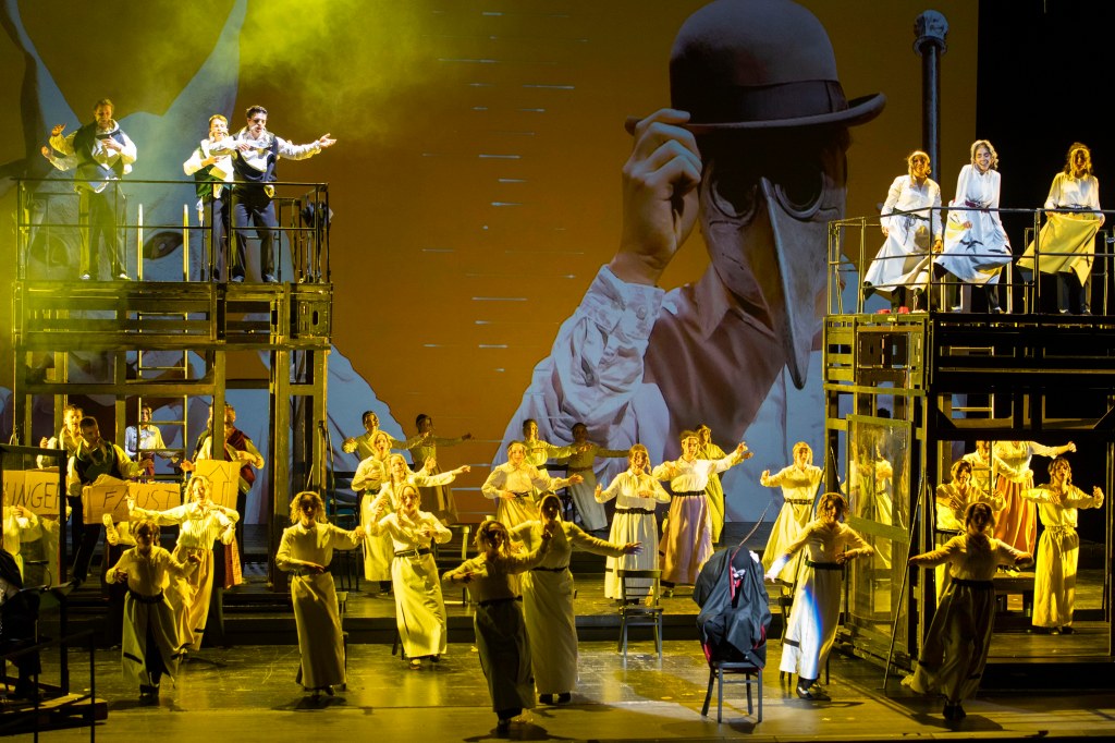 Augen und Ohren sind natürlich auf die 55 Kinder und Jugendlichen gerichtet, die eine fantastische Leistung auf der großen Bühne vollbringen. 100 Minuten still stehen gilt für die hinteren Reihen, die weniger Anteil am schauspielerischen Geschehen haben, aber gleichzeitig Kraft und Stärke in die Chöre bringen. Eine weitere Herausforderung? Ekaterina Klewitz, die das Stück in Kleinstgruppen und unter striktesten Sicherheitsvorkehrungen probte, dirigiert das Beethoven Orchester Bonn aus einem maximal abgesenkten Graben. Zusätzlich schirmt ein eigens gespanntes Grabentuch das Orchester vom Bühnengeschehen ab. Große Distanz also, wo doch die Chorleiterin und Dirigentin Ekaterina Klewitz so viel von ihrer Energie über die Körpersprache vermittelt. Die Sängerinnen und Sänger erleben sie nur über den Monitor.