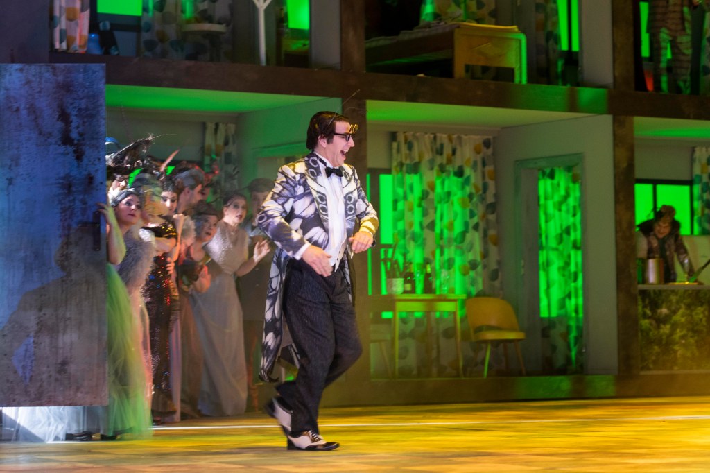 Aber damit sind wir natürlich schon im Gartensalon des Prinzen, den der Kapellmeister mit „pomp and circumstance“ ankündigt. Er fordert er das Publikum auf, sich zu majestätischen Tönen zu erheben. Aber hier wachsen die Bäume wahrhaftig nicht in den Himmel, sondern das Dschungelgrün hängt von der Decke  und Beethoven persönlich spielt zum Csárdás der ungarischen Gräfin alias Rosalinde von Eisenstein auf. Allerdings schwebt er mit seinem Pianoforte in der Luft. Er steht halt über den Dingen.