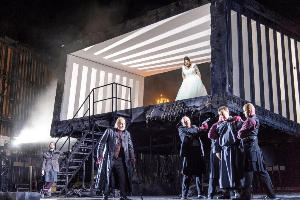 Wie wird aus diesem Wirrwarr eine so unterhaltsame Opernproduktion? Indem der wilde Mix in eine Kunst des Kontrasts mündet. Die vier Akte könnten unterschiedlicher nicht sein. In riesigen Lettern prangen ihre Titel auf dem Vorhang: Der Geächtete, Der Pakt des Todes, Die Verschwörung und Der Altar der Rache (Im original Libretto Der Bandit, Der Gast, Die Güte, Die Maske). Auf der Bühne gibt es dazu Silvas Palast – nicht als goldenen, sondern als eiskalten, grau-weißen Käfig. Wie die Landekapsel eines Raumschiffs steht sie auf gespreizten Stahlträgern und Baustützen. Im Mauerwerk sind allerdings Einschusslöcher zu sehen, das ganze Gebäude also angeschlagen und fragil. Bodenhaftung und Verbindung zum wilden Räuberleben außer- oder unterhalb dieser adligen Gesellschaft bildet eine Treppe.