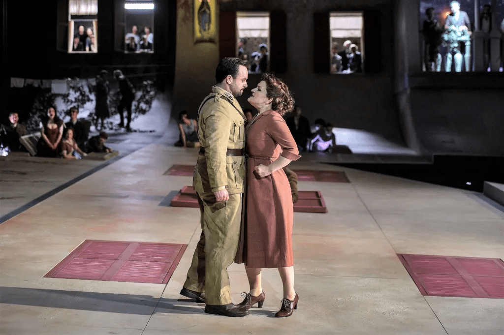 Die Handlung verlegt sie in die 50-er Jahre des vorigen Jahrhunderts, die Sängerinnen und Sänger agieren auf einer um 90 Grad flachgelegten Fassade eines Hauses in Süditalien. Die Rückwand allerdings bildet ein dreibögiger Renaissance-Balkon, auf dem Leonato (Sébastien Dutrieux) wie ein x-beliebiger Rentner am Abend die Blumen in den Balkonkästen gießt. Ein unfreiwillig komischer Spießer in Nadelstreifen, dem man die reizende Tochter Héro und die emanzipierte Nichte Béatrice kaum zutraut. Klar ist: Die jungen Frauen kommen aus gutem, wohlhabenden Haus. Neben dem Palazzo die geöffneten Fenster eines sizilianischen Mietshauses. Da wird geraucht, gestritten, Geige geübt, ein besoffener Ehemann gescholten. Das richtige Leben halt.