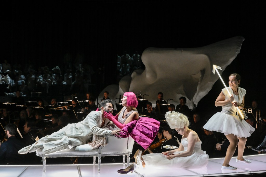 Die Ringform spiegelt das Kreisrund des antiken Amphitheaters, dessen Stufen Platz bieten für den mit 80 Sängerinnen und Sängern reich besetzten Chor – wobei Berlioz im Originalprogramm seines Poème Lyrique noch üppige 200 bis 300 Chormitglieder veranschlagte. Für die Akustik übrigens ein Segen, das gesamte Bühnenrund mit Wänden zu versehen. Links vom musikalischen Kreis eine kleine Nebenbühne für den Palast der Dido in Karthago – mit vielfältigem filigranen Blumenschmuck als Symbol für die Erdverbundenheit der Karthager und ihrer Verehrung für Ceres, die Göttin des Ackerbaus. Das Pendant auf der rechten Seite bildet das Podest für sechs Harfen, die nicht nur prächtig aussehen, sondern der Liebesszene auch den zärtlich-süßen Schmelz verleihen.