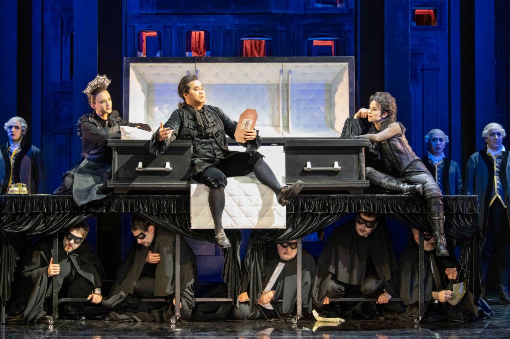 Der Maskenball bietet als Kostümfest die perfekte Kulisse für diesen Mord. Zumal Renato es nicht als einziger auf Riccardos Leben abgesehen hat. Um Tom und Samuel (amerikanische Namen als winziges Lokalkolorit), gesungen von Martin Tzonev und Andrei Nicoarä, beide Bass, schart sich eine Gruppe von Verschwörern. Sie opponieren gegen Riccardos Maßnahmen. Wie die Panzerknacker, die original Beagle Boys, hocken sie in der ersten Szene verborgen unter dem Sarg. Ja, noch lebt Riccardo, aber wie eine Botticelli-Venus entsteigt er – nicht einer Muschel – sondern einem exquisit ausgepolsterten Sarg. Dort hinein legt er sich am Ende als Toter wieder: Anfangs- und Schlussbild identisch, das Leben ein Perpetuum mobile.
