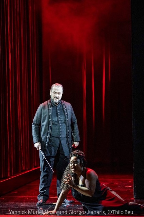 Yannick Muriel Noah gibt die Amelia mit ihrer großen, besonders vielseitigen und wandlungsfähigen Stimme. Sie interpretiert alles Leid einer verzweifelten Mutter, alle Leidenschaft, Angst, Verzweiflung und Zuversicht in ihre erste große Arie „Ecco l’orrido campo“ (Hier die Stätte des Grauens) differenziert. Die Kraft eines strahlenden Soprans verbindet sie mit ihrer agilità für die Koloraturen. Großer Applaus trägt sie von hier in das Duett mit Riccardo „Teco io sto“ (Ich bin bei dir) . Die Regie führt die beiden ein paar Minuten lang in großem Abstand, bis sie schließlich einander umarmen. Das Publikum hält den Atem und fühlt sich dem Liebespaar im Großmut des Entsagens tief verbunden. Innig verschmelzen sie nach diesem grandiosen Duett und Arthur Espiritu/Riccardo scheint von seinen eigenen Gefühlen überwältigt. Das Premierenpublikum versüßt ihm diesen Moment mit enormem Applaus und Will Humburg lässt Zeit … Ein ergreifend schöner Opernmoment!