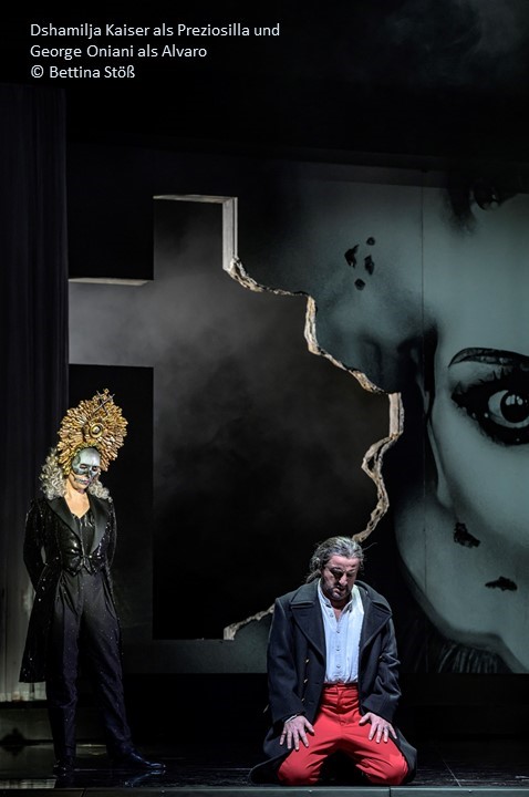 Regiefinesse von Pountney: Er macht sie zur Mistress of Ceremonies, zur Gastgeberin auf dieser Bühne des kleinen und großen Welt- und Kriegstheaters. Preziosilla spielt Dompteurin und Henkerin, Zirkusartistin und Flintenweib, Komödiantin und schweigendes Nummerngirl, Marketenderin und Entertainerin – und sie hat Spaß dabei! Dshamilja Kaiser verkörpert diese vielschichtige Figur verführerisch, entschlossen, ironisch und dominant. Sie hält den Taktstock für den Lebensrhythmus in der Hand wie einst der stampfende Lully. Ihr dreimaliges Klopfen symbolisiert die Dreieinigkeit, das viermalige am Ende verweist auf die Ewigkeit.