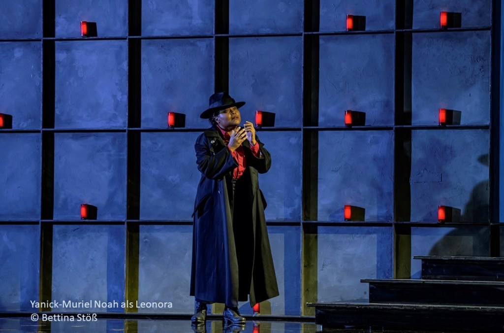 Pietà erflehen die Protagonisten hier so oft wie in keiner anderen Oper. Das zweithäufigste Wort ist vendetta. Gnade und Rache als zentrale Emotionen der Dreier-Konstellation von Leonora, Alvaro und Don Carlo. Die junge Adelstochter (Yannick Muriel Noah) liebt einen Mann zunächst unbekannter Herkunft und will mit ihm fliehen. Unbeabsichtigt löst sich ein Schuss, und der Vater, der Marchese von Calatrava, stirbt. Das Paar verschwindet in die Nacht und wird für viele Jahre getrennt. In Männerkleidern sucht Leonora Obdach und Sicherheit in einem Kloster, das von ihrer Familie finanziert wird. Beten möge ihr Gottes Gnade und Verzeihung bescheren, mit dem asketischen Leben und der lebenslangen Abgeschiedenheit ihr Unrecht gesühnt werden.