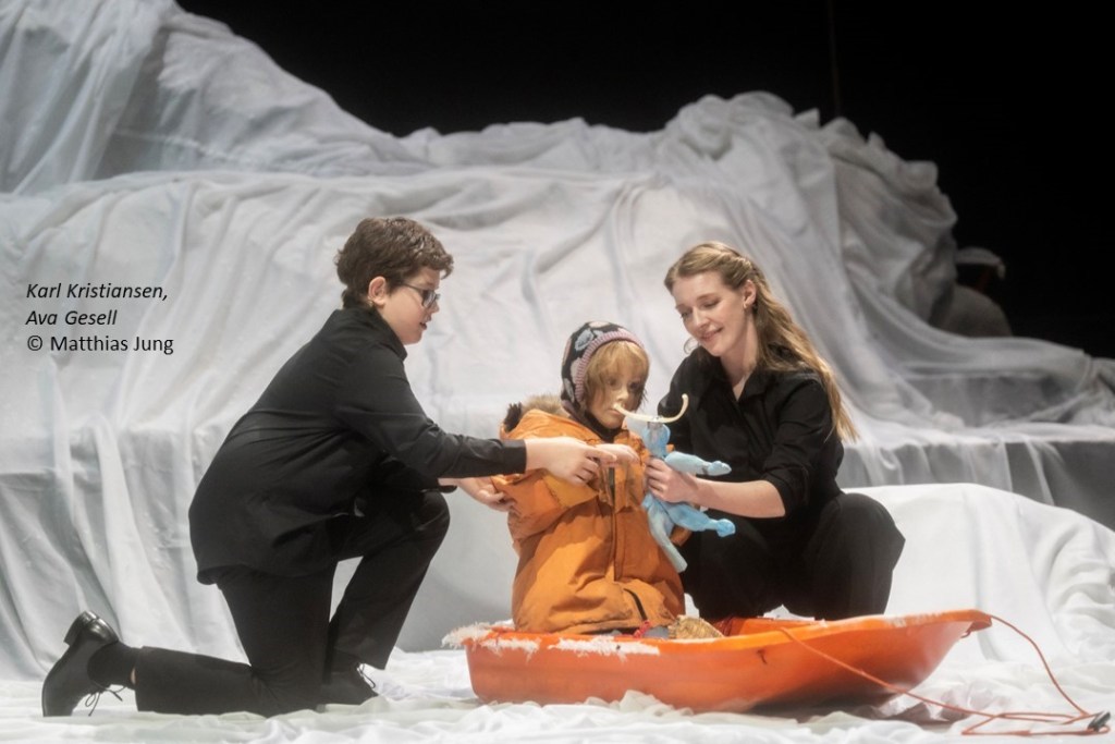 Was passiert auf der Bühne? Welche Geschichte hat das Autorenkollektiv mit dem Komponisten Jan Dvorák, Regisseur Thomas Fiedler und der Dramaturgin Julia Warnemünde geschaffen? Auf einen Nenner gebracht: den Kreislauf des Lebens. Ein Hubschrauber setzt eine Polarforscherin an ihrer Station im dunklen Teil des arktischen Winters ab. Hier lässt ein rätselhafter Virus Tiere verenden, aber die Befürchtung, es könne auch den Menschen befallen, tritt nicht ein. In ihrer Einsamkeit bringt sie ein Kind zur Welt, dem ihre ganze Liebe und Fürsorge gilt – allerdings in Form einer leblosen Puppe. Die weiteren Dramatis personae sind eine Doppelgängerin, ein Junge, ein Mann. Hinzu kommt der Hirschmann, eine lebensgroße Zentaurgestalt, oben Mensch mit Hirschgeweih, unten stark behaarte Hirschbeine mit Hufen.